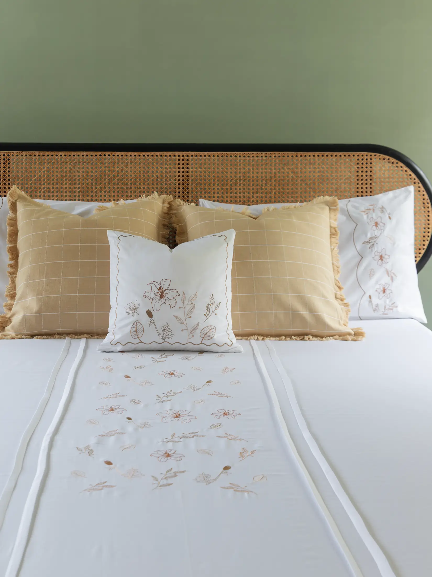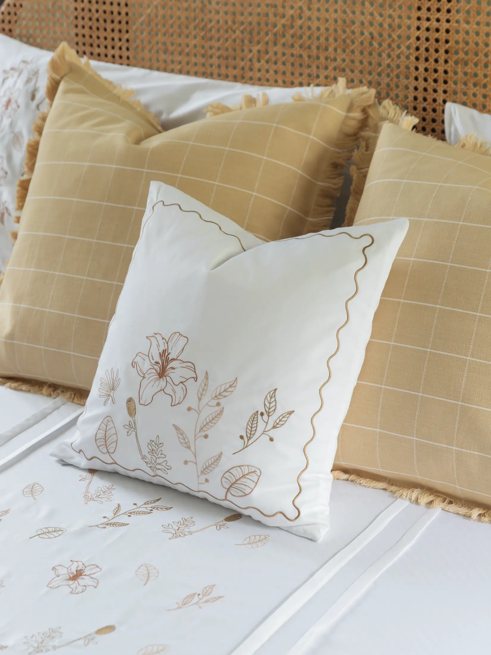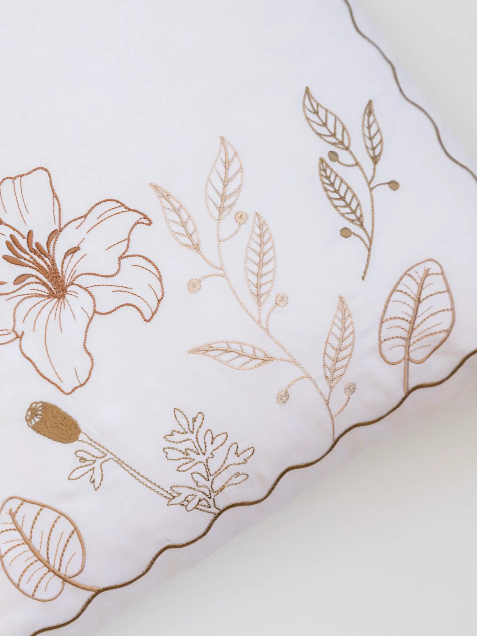 Graceful and understated, the Autumn Petal Scallop Cushion Cover brings delicate detailing to everyday spaces. Set on a crisp white base, the cushion features warm-toned floral embroidery complemented by a soft scallop-style embroidered border that frames the design beautifully. The fine linework and earthy hues create a balanced, heirloom-inspired aesthetic, making it ideal for layering on sofas, beds, or accent chairs. Designed for homes that appreciate thoughtful craftsmanship and subtle statement pieces.