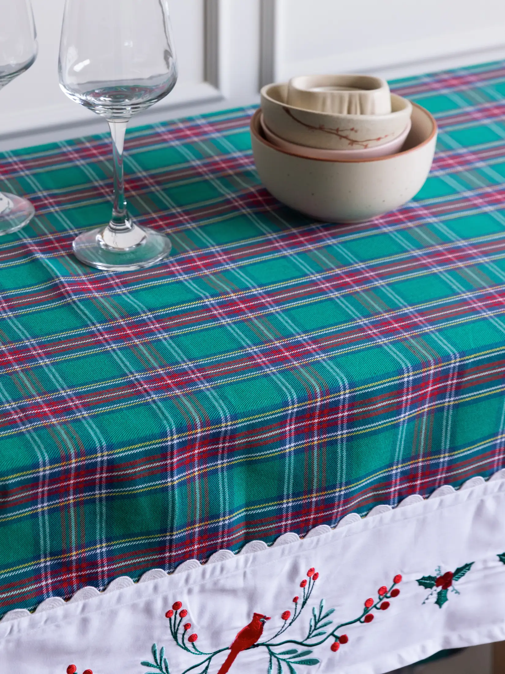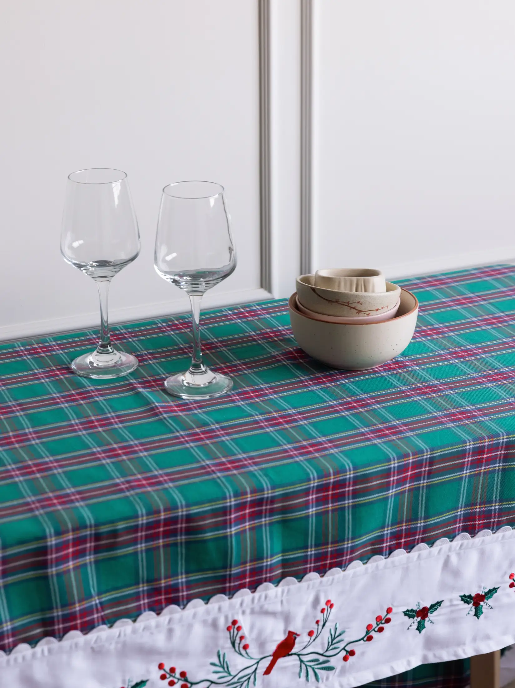 The Cardinal Tartan Embroidered Table Cover captures the nostalgic charm of winter celebrations. Crafted in green tartan checks, it features detailed embroidery of a bright red cardinal surrounded by soft floral accents — a quiet nod to holiday warmth and timeless winter tablescapes.