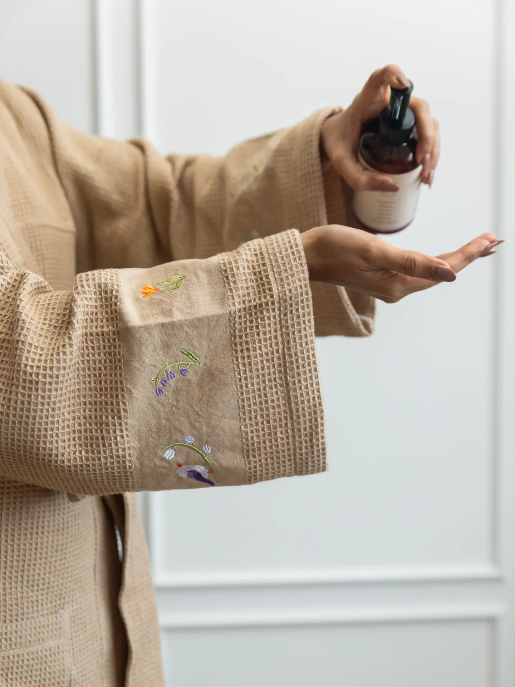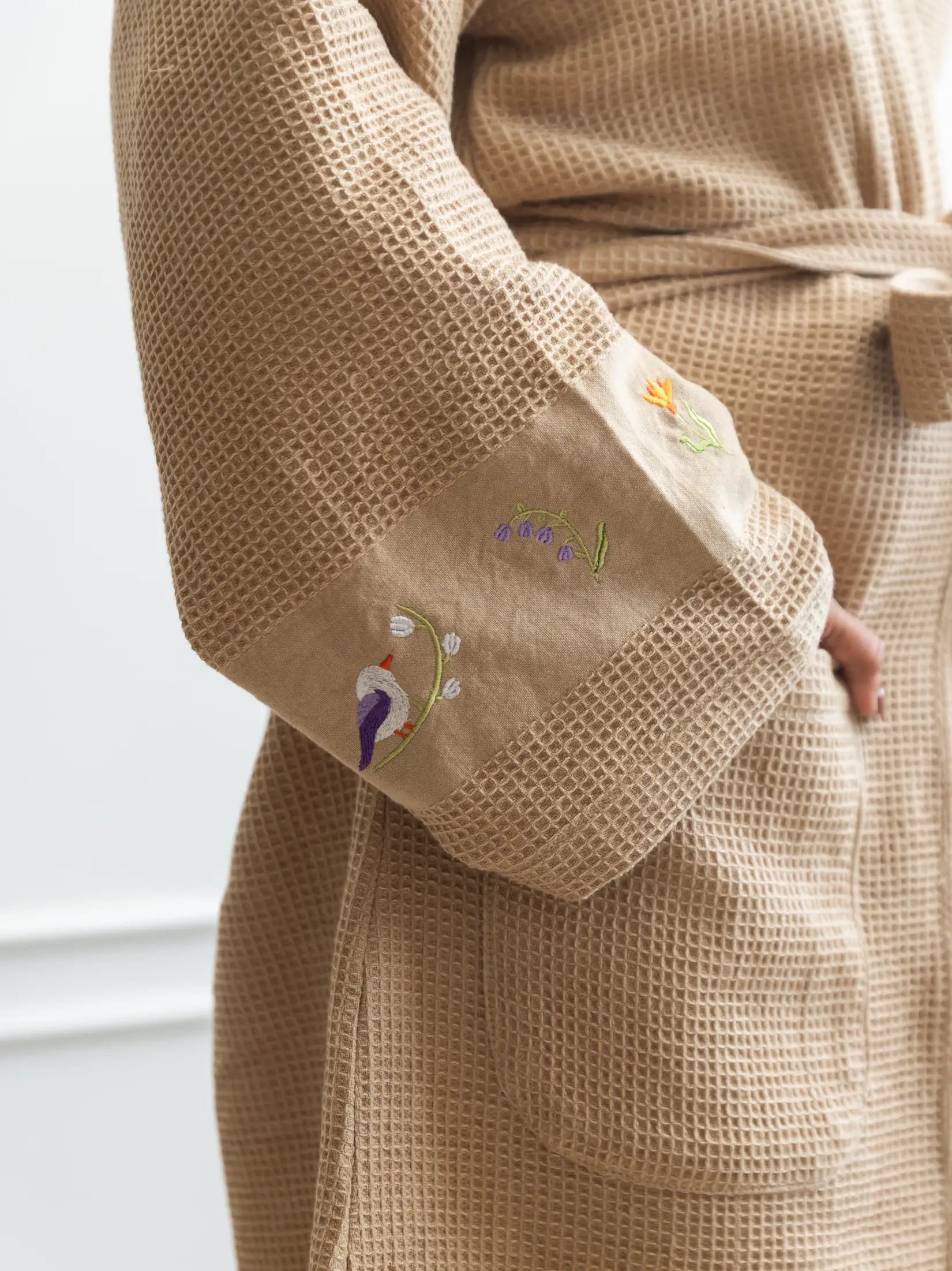 Finished in a warm French beige tone, the robe is accented with subtle detailing on the sleeves, adding just the right amount of character without overpowering its simplicity. Thoughtfully made in Kannur,Kerala, this piece reflects a commitment to long-lasting quality and a slower, more intentional way of living.