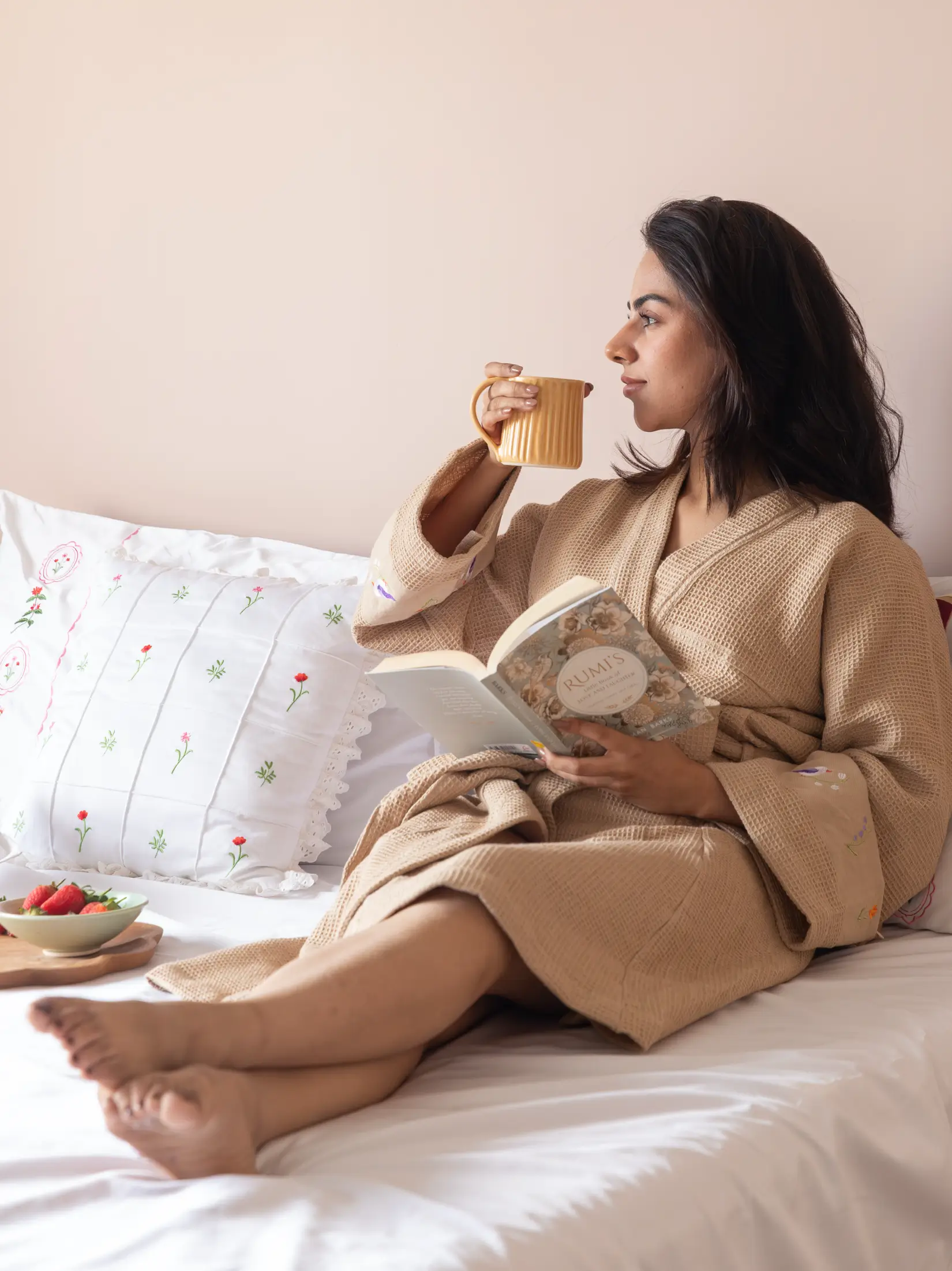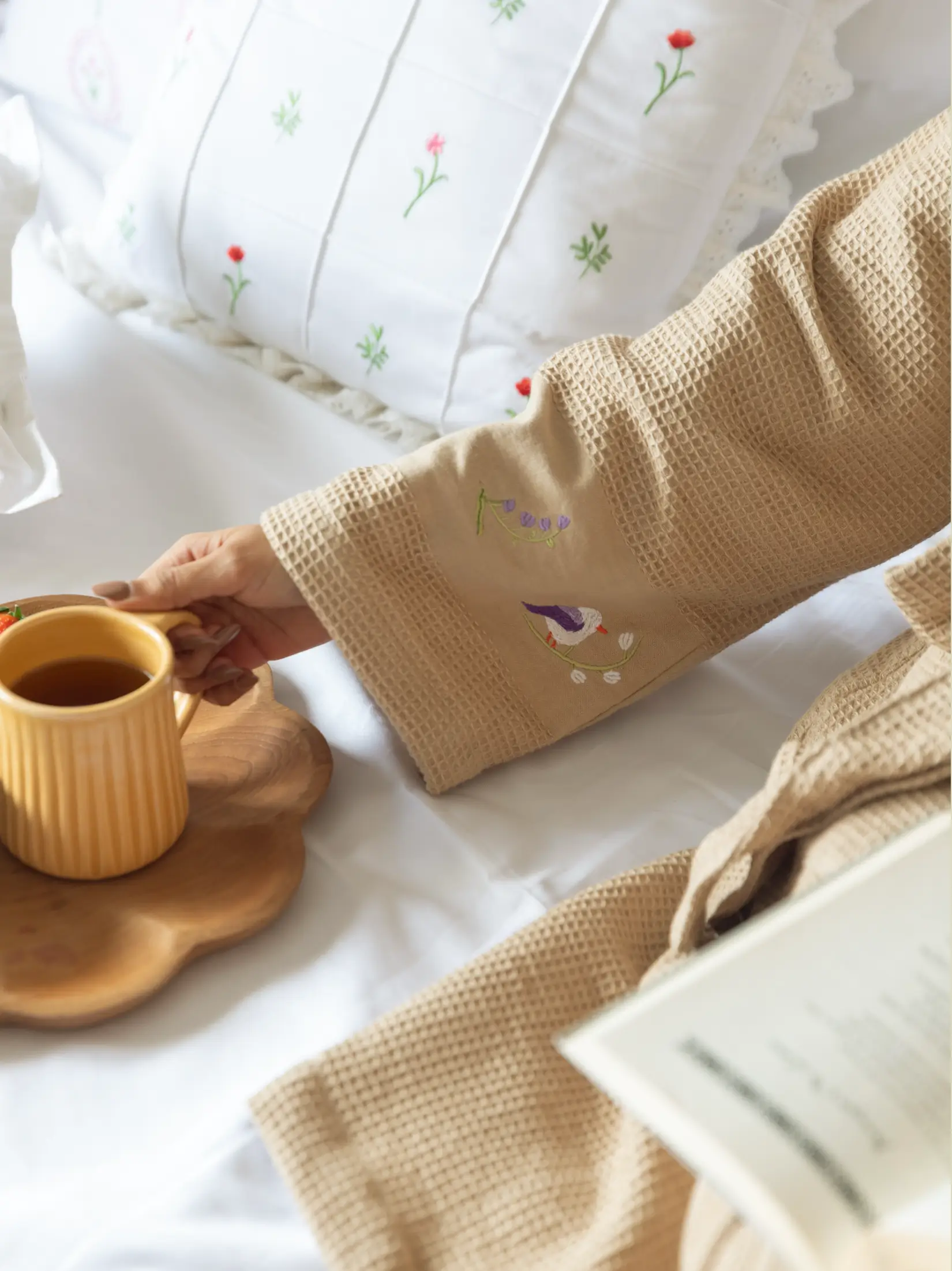Finished in a warm French beige tone, the robe is accented with subtle detailing on the sleeves, adding just the right amount of character without overpowering its simplicity. Thoughtfully made in Kannur,Kerala, this piece reflects a commitment to long-lasting quality and a slower, more intentional way of living.