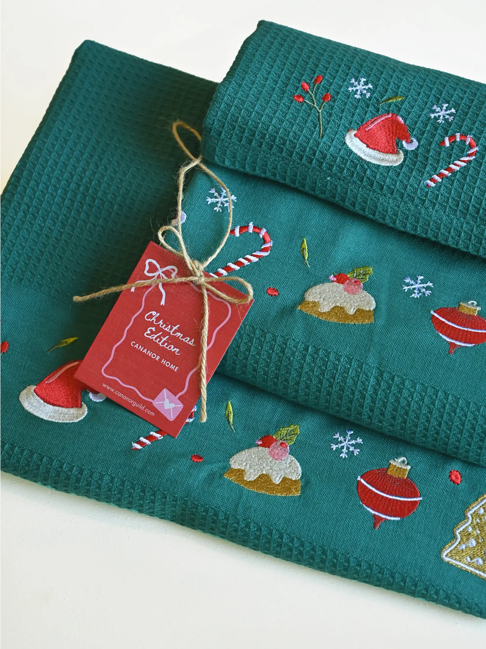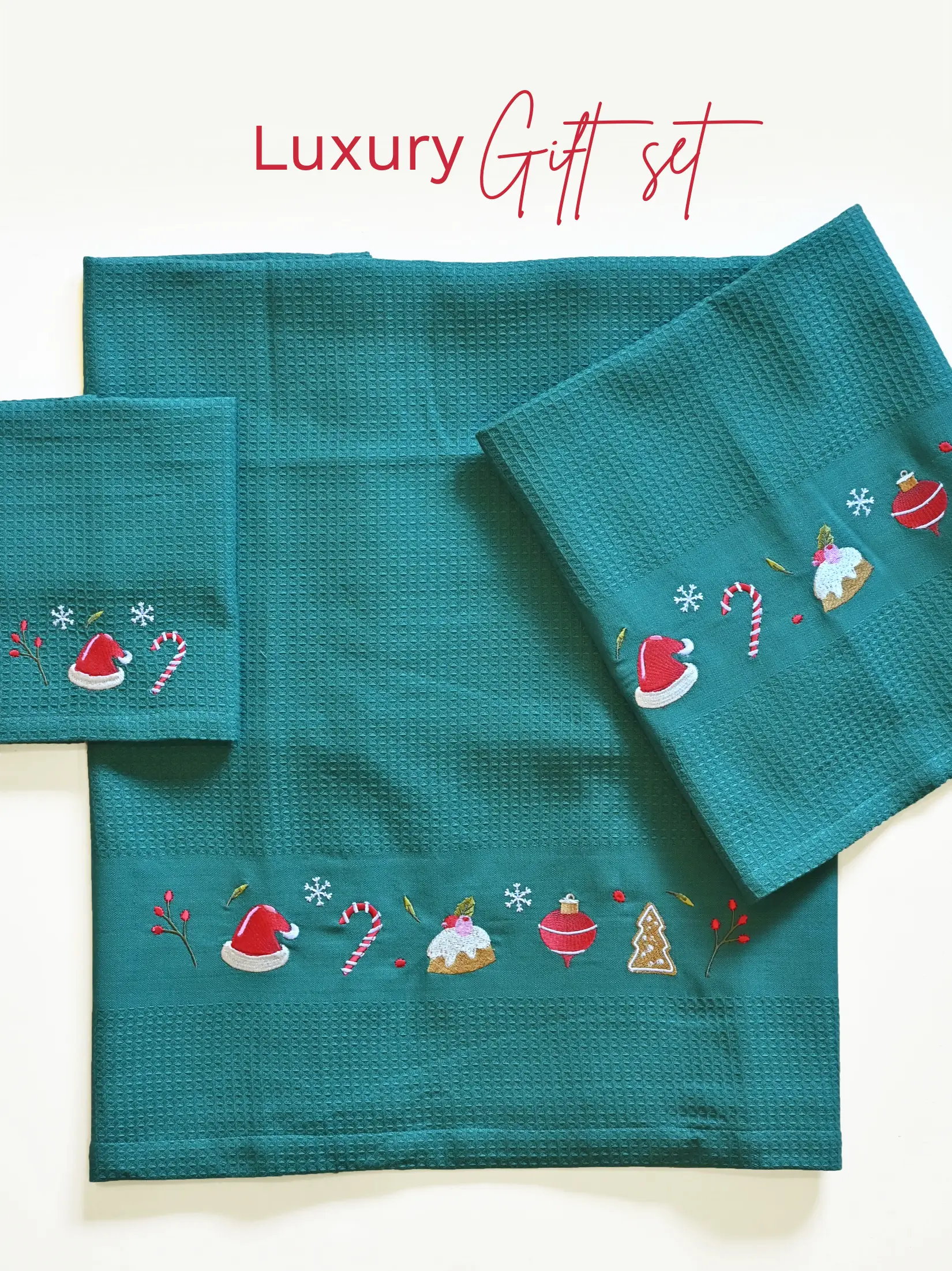 Celebrate the warmth of the season with our Holiday Spirit Bath Linen Set. Crafted in a rich green honeycomb weave, this set features festive Christmas embroideries that capture the joy and comfort of winter mornings. Each towel is soft, absorbent, and thoughtfully designed for the holidays—complete with a reusable gift bag that makes it perfect for gifting or personal indulgence.
