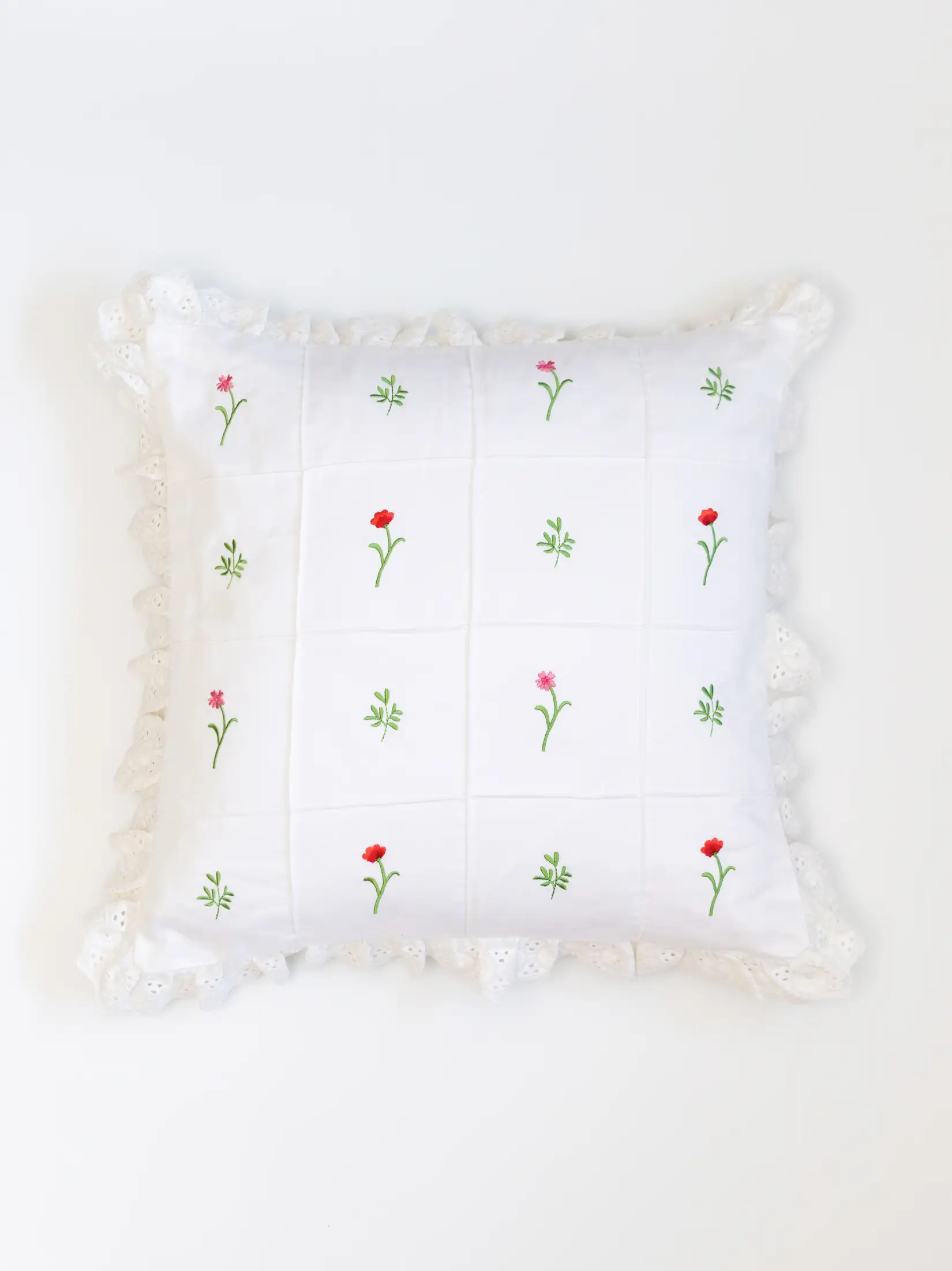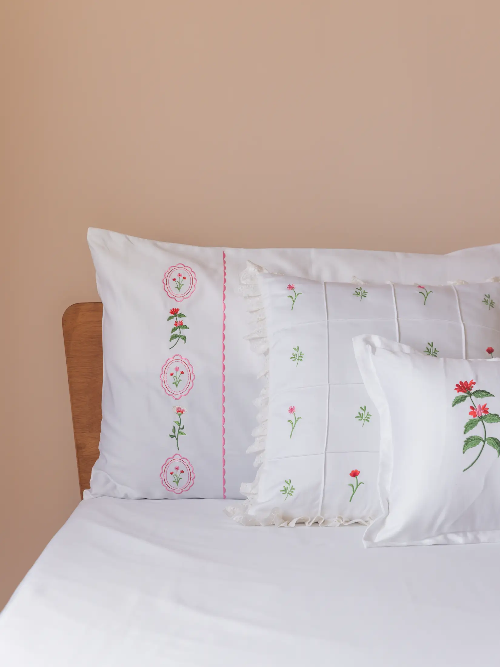 Delicate and thoughtfully detailed, the Keepsake Garden Pintuck Cushion Cover brings a gentle, heirloom charm to your space. Crafted on a crisp white base, the cushion features soft pintuck paneling that creates subtle texture and structure. Scattered floral embroidery in fresh tones adds a playful yet refined touch, while the lace-style ruffle edging enhances its romantic appeal. Perfect for layering on beds, sofas, or reading corners, this cushion cover blends craftsmanship with everyday warmth.