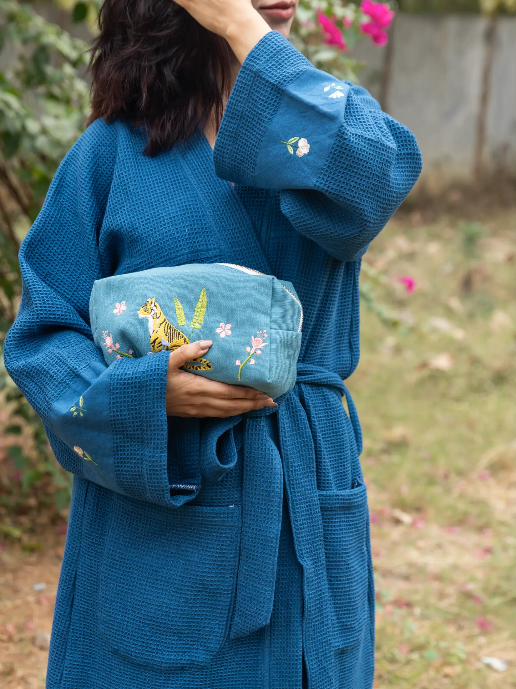 The deep nightfall blue tone brings a sense of calm and familiarity, making this robe a quiet essential for morning rituals and evening wind-downs. Thoughtfully made in Kerala, it reflects a slow-living philosophy focused on durability, comfort, and everyday ease.